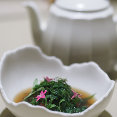 【鄉村記憶-田雞腿/貝類/白蒜/綜合香草】 這道菜靈感發想,是蔡中和兒時外婆常煮的「田雞蒜頭蛤蜊湯」,蒜頭風味茶碗蒸為基底,田雞腿、綜合貝類與蛤蜊田雞湯,淋上九層塔、巴西里製成之香草泥提香。 至此可以發現,餐具、器皿非常具有整體性與一致性,表現出優雅、樸直的特質。甚至空間與服務人員服裝的色系,都擁有大地色的一致性,簡潔、專業而不具壓迫感或高冷感。 看過一些Fine dining餐廳,選用很多無比昂貴、獨一無二的餐盤,但卻無法與整套套餐有連貫性搭配,要做到菜跟盤搭、上下道至整套餐盤搭,想必主廚心思一定很縝密,不單一思考,而是整體規劃。